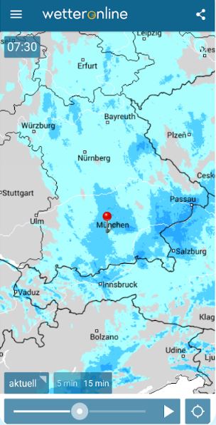 RegenRadar ist eine App des Portals wetteronline.de, mithilfe derer Sie vor dem Grillfest oder der Fahrradtour die voraussichtliche Niederschlagsmenge prüfen können. Das Tool liefert Informationen zu Niederschlägen in ganz Deutschland, Österreich und der Schweiz und aktualisiert sich alle 15 Minuten durch einen automatischen Abgleich mit der WetterOnline-Datenbank. Ihren Standort können Sie entweder manuell eingeben oder sich über die GPS-Ortungsfunktion finden lassen. Anschließend ziehen die dynamischen Regenschauer in Form einer Schleife über die in den nächsten Stunden betroffenen Gebiete hinweg. Je blauer die Wolke ist, desto höher ist auch die Regenwahrscheinlichkeit.