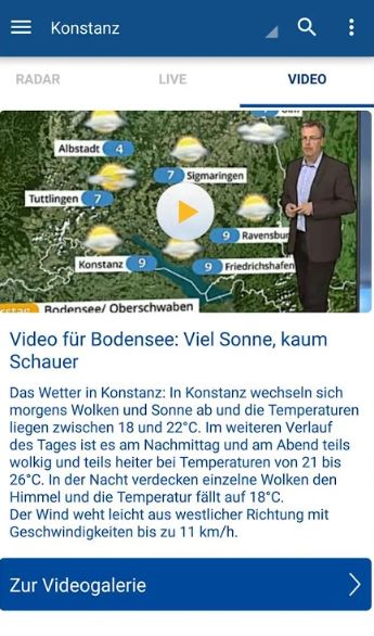 Die App des gleichnamigen Online-Portals ist zugleich eine der beliebtesten Ihres Genres und präsentiert neben vielen weiteren Funktionen auch Videos des aktuellen Wetters. Nach dem Start legen Sie als erstes Ihren aktuellen Standort fest. Diesen können Sie wahlweise über die Suche eingeben oder automatisch via GPS erfassen lassen. Im Anschluss bekommen Sie direkt die aktuelle Temperatur, die Sonnenaufgangs- und Sonnenuntergangszeit, die Windgeschwindigkeit, die Regenwahrscheinlichkeit sowie die Höchst- und Tiefsttemperatur angezeigt. In der Detailansicht können Sie sich außerdem noch über die gefühlten Temperaturen, den Luftdruck und die prognostizierte Niederschlagsmenge informieren.