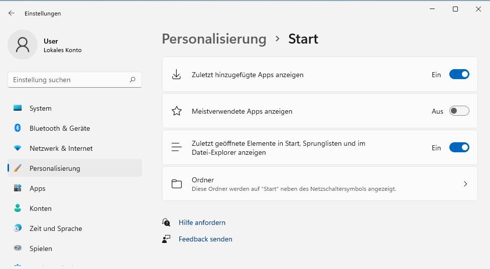 Im Abschnitt „Ordner“ können Sie festlegen, welche Ordner im Startmenü noch angezeigt werden.