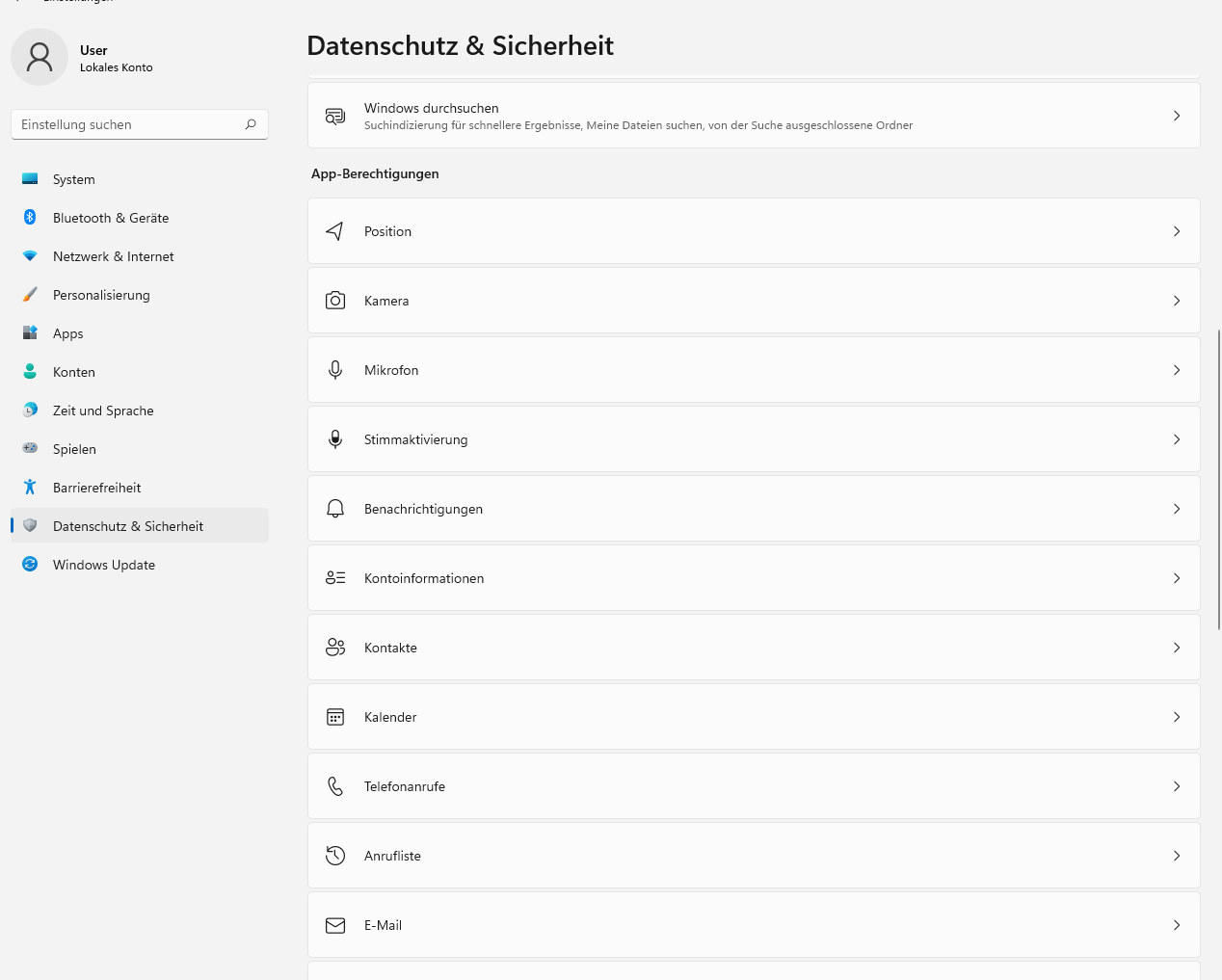 Den Zugriff auf den Standort, Kamera, Mikrofon, Kontakte, Kalender usw. regelt Windows im Abschnitt App-Berechtigungen und kann für jedes Programm einzeln aktiviert oder deaktiviert werden.