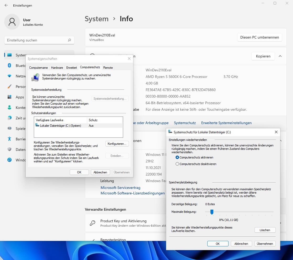 Allem voran wäre als wichtige Einstellung der Computerschutz zu aktivieren. Der Computerschutz, welcher auch in Windows 10 in den Standardeinstellungen deaktiviert ist, kann Windows Änderungen an Systemdateien, beispielsweise durch ein Update, über Systemwiederherstellungspunkte wieder rückgängig machen kann. Sie können den Computerschutz über die Einstellungen > „System“ > „Info“ hinter dem Texteintrag „Systemschutz“ aktivieren und auch festlegen, wie viel Speicherplatz für den Computerschutz reserviert wird. Ältere Einträge werden dann gelöscht, wenn der Schutzspeicher vollständig belegt ist.