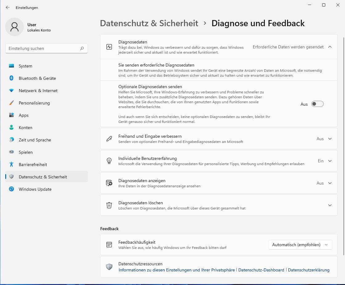 Die „Online-Spracherkennung“ sowie „Freihand- und Eingabeanpassung“ können Sie auch ohne Nachteile abschalten. In „Diagnose und Feedback“ können Sie erweiterte Diagnosedaten abschalten, wenn Sie nicht auf das Windows 11 Insider-Programm wechseln. Hier sind die erweiterten Diagnosedaten Zugangsvoraussetzung.