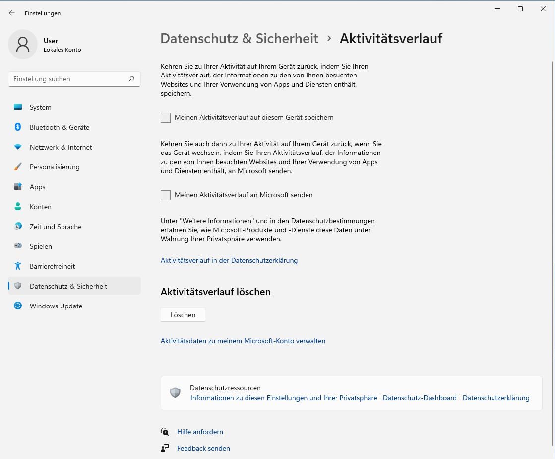 Vorsichtige Nutzer schalten auch den Aktivitätsverlauf in Windows 11 aus, welcher natürlich auch nicht an Microsoft gesendet werden sollte. Die Funktion wurde in einem späteren Update von Windows 10 als Zeitleiste (Timeline) eingeführt.