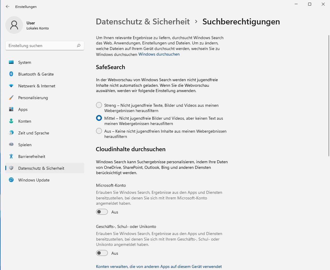 In den Suchberechtigungen können Sie anpassen, welche Inhalte in der Webvorschau bei einer Suche aus dem Desktop bereits ausgefiltert werden und anpassen, ob die Suche auch Cloudinhalte von Diensten wie OneDrive, SharePoint, Bing usw. berücksichtigen soll.