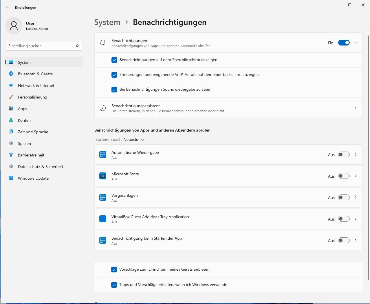 In Windows 11 ist der bisherige Info-Center weggefallen. Die Benachrichtigungen werden jetzt zusammengefasst und auch neu organisiert. Um festzulegen, welche Apps Sie wie benachrichtigen dürfen, sollten Sie diese Einstellungen öffnen. Sie finden die notwendige Funktion unter System > Benachrichtigungen. Der Eintrag „Vorschlagen“ ist dabei im Grunde Werbung und sollte auf jeden Fall deaktiviert werden. Sie können auch festlegen, wo Benachrichtigungen überall angezeigt werden dürfen.