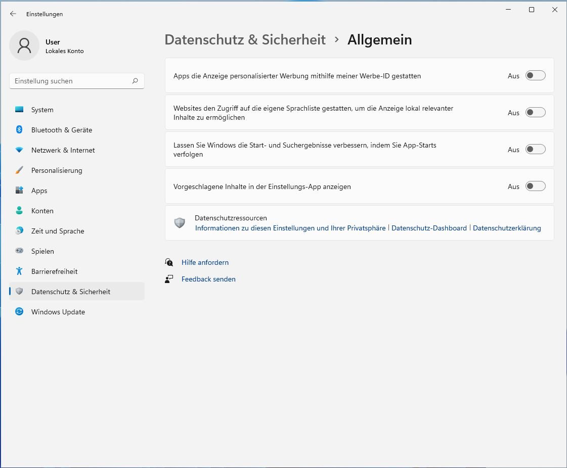 Windows 11 fragt bereits bei der Installation die Datenschutzeinstellungen an. Es bietet sich aber an, diese nach der Installation nochmals zu prüfen und analog zu den empfohlenen Datenschutzeinstellungen von Windows 10 anzupassen.