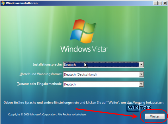 Legen Sie Ihre Windows-Installations-DVD ein und booten Sie von dieser. Es erscheint der Windows-Installationsassistent mit Sprache, Uhrzeit und Tastatur-Eingabe. Klicken Sie auf den kleinen Button „Weiter“.