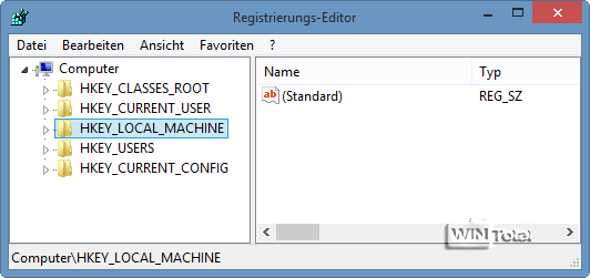 Geben Sie in die Eingabeaufforderung regedit.exe ein und drücken die [Enter]-Taste. Klicken Sie auf den Zweig „HKEY_LOCAL_MACHINE„, sodass er markiert ist, dann im Menü auf „Datei -> Struktur laden„.