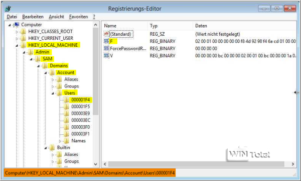 Dieser Unterschlüssel „000001F4“ ist für das aktuell noch deaktivierte Administrator-Konto zuständig.
