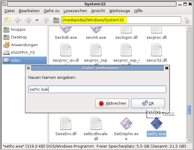 Öffnen Sie im Dateimanager von Knoppix den Pfad /media/sda2/Windows/System32 Hier befindet sich die Datei sethc.exe. Markieren Sie die Datei per Mausklick, drücken Sie dann die [F2]-Taste, um die Datei in sethc.bak umzubenennen. Im gleichen Ordner liegt die cmd.exe, ziehen Sie die Datei bei gedrückter Maustaste auf den Desktop. Benennen Sie die Datei cmd.exe hier in sethc.exe um und ziehen Sie diese zurück in den Ordner /media/sda2/Windows/System32. Sie haben damit sethc.exe durch eine Kopie von cmd.exe ausgetauscht und für später eine Sicherungskopie der originalen sethc.exe angelegt. Beenden Sie und entfernen Sie die Live-CD.