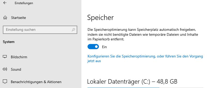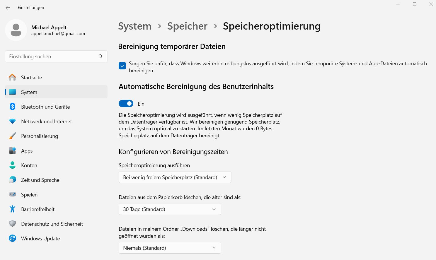 Windows 10 und Windows 11 bieten die Möglichkeit, den Papierkorb in bestimmten Zeitabständen automatisch zu leeren, um Speicherplatz freizugeben. Sie finden die dafür zuständige Funktion bei Windows 11 in den Einstellungen -> System -> Speicher -> Speicheroptimierung.