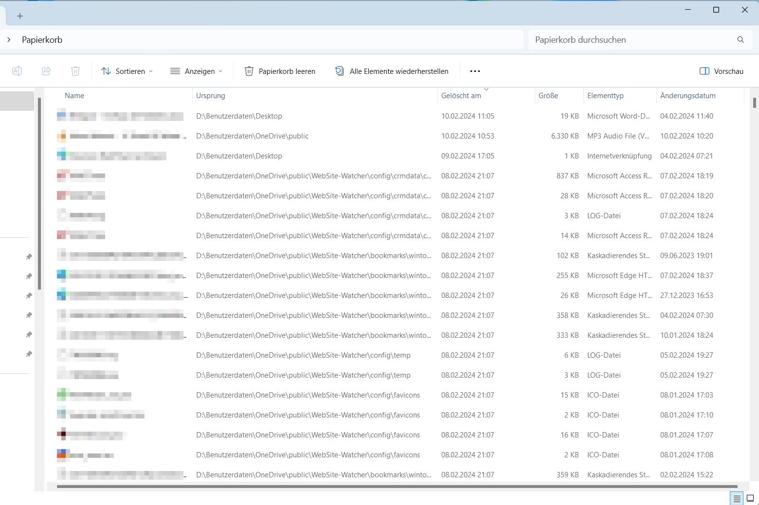 Ein Doppelklick auf den Papierkorb öffnet den Windows-Explorer. Wenn Sie die Detailansicht aktivieren, sehen Sie den ursprünglichen Pfad, das Löschdatum, die Größe, den Dateityp usw. Über das Kontextmenü oder die Funktionsleiste des Explorers können Sie die gelöschten Dateien an ihrem Ursprungsort wiederherstellen.