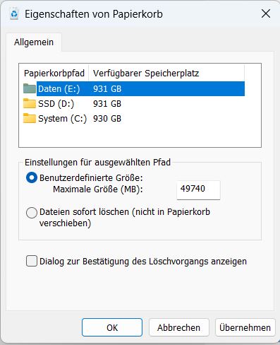 Nein, Sie können den Windows-Papierkorb für jedes Laufwerk einzeln aktivieren und anpassen.