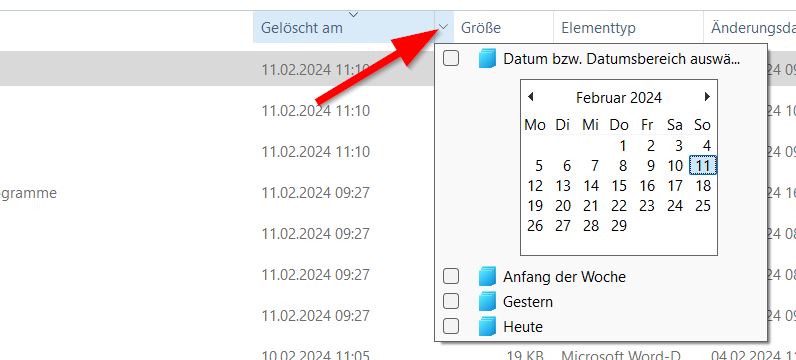 In den Details können Sie auch Filter setzen, um sich z.B. nur Dateien mit einem bestimmten Löschdatum anzeigen zu lassen. Klicken Sie dazu auf den Pfeil nach unten bei „gelöscht am“.