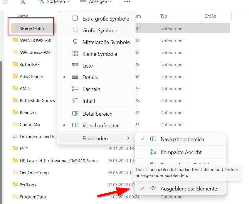 Das Papierkorbverzeichnis befindet sich auf jedem Laufwerk versteckt als $Recycle.Bin und kann im Windows-Explorer angezeigt werden, wenn die Anzeige versteckter Elemente aktiviert ist.