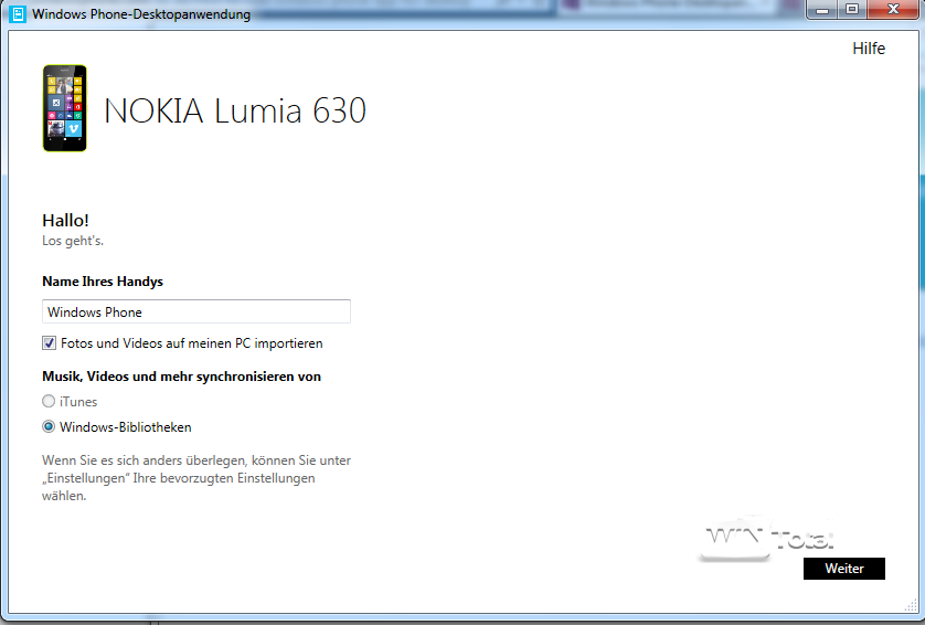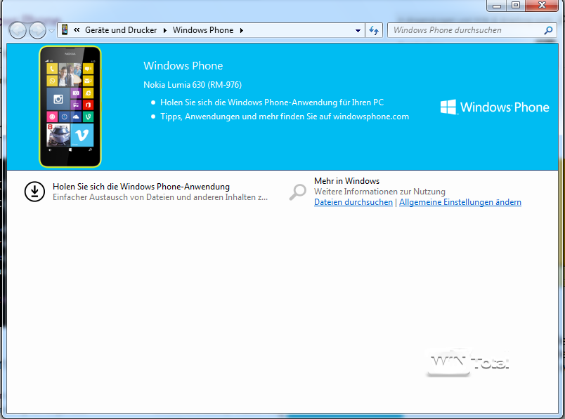 Nach der ersten Verbindung wird das Gerät in Windows angezeigt und ein Hinweis auf die kostenlose Windows Phone-Desktopanwendung gegeben.