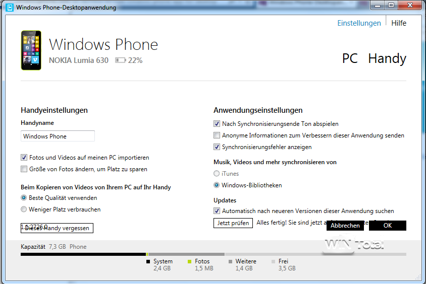 Für Windows 7 und höher bietet Microsoft die Windows Phone-Desktopanwendung, welche folgende Features bietet: