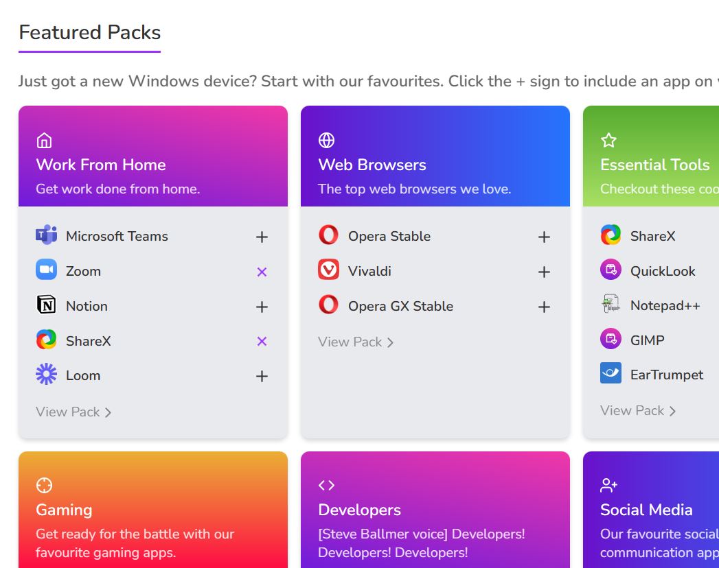 Mit der Webseite https://winstall.app können Sie sehr einfach aus dem Repository von Winget die Programme auswählen, für die Sie später ein Installationsskript erstellen möchten. Wählen Sie dazu durch Klick auf das „Plus-Zeichen“ die gewünschten Programme aus.