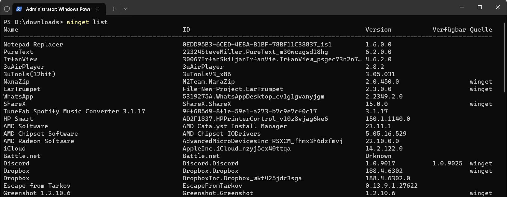 Nachdem Winget installiert ist, steht das Tool über die Kommandozeile oder PowerShell zur Verfügung und kennt unter anderem folgende Befehle: