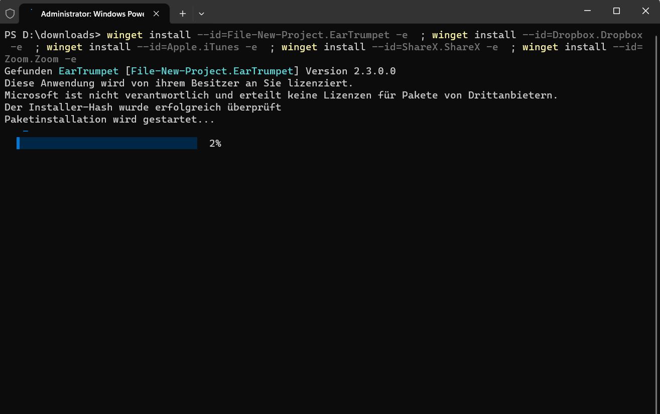 Wenn Sie sich den Befehl in einer Textdatei speichern, können Sie diesen bei einer Neuinstallation immer wieder verwenden und/oder nutzen, um weitere Programme ergänzen. Der Befehl lädt damit automatisch immer die neuste Version der Programme herunter.