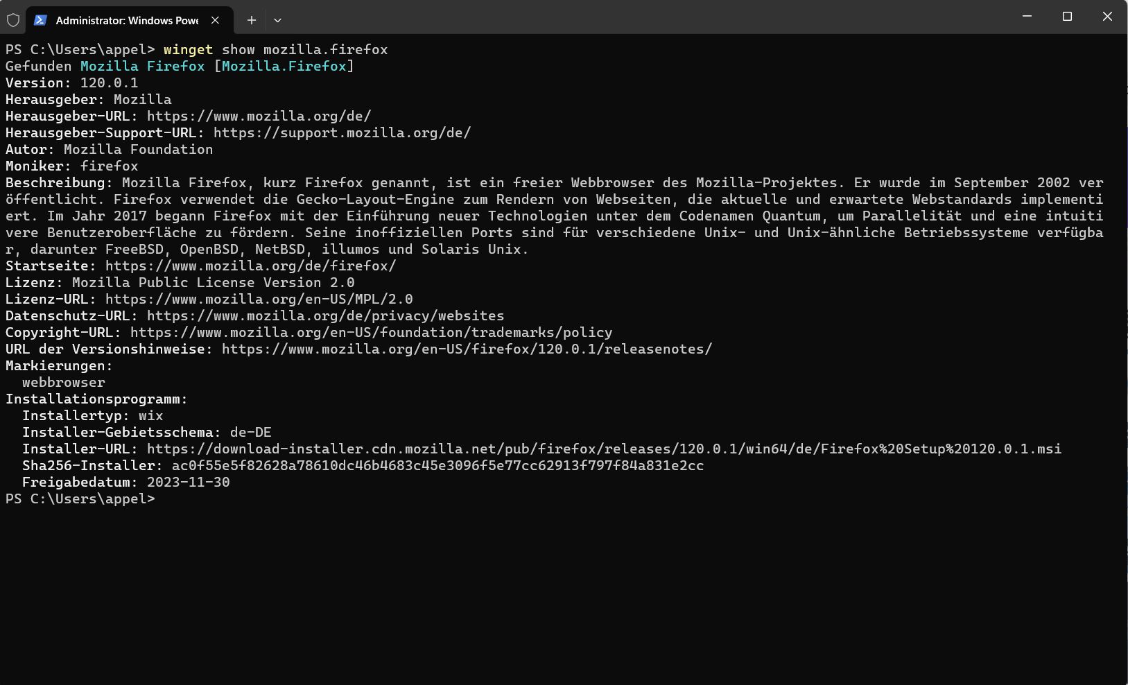 Wenn Sie hier keine Befehle sehen, muss Winget auf älteren Windows-Systemen (ab Windows 10 Version 1709) erst installiert werden. Dazu gehen Sie wie folgt vor: