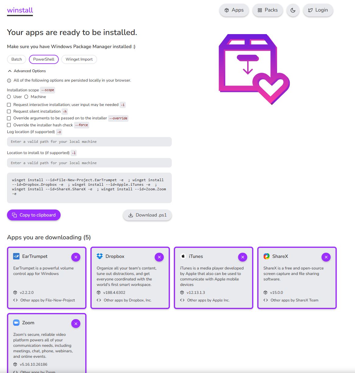 In dem Fenster sehen Sie nochmals alle ausgewählten Programme, können diese hier noch abwählen und finden dann oben im Textfeld das Skript für PowerShell oder die Batch der Kommandozeile. Mit „Advanced Options“ können Sie noch weitere Parameter wie die „Silent“-Installation angeben.